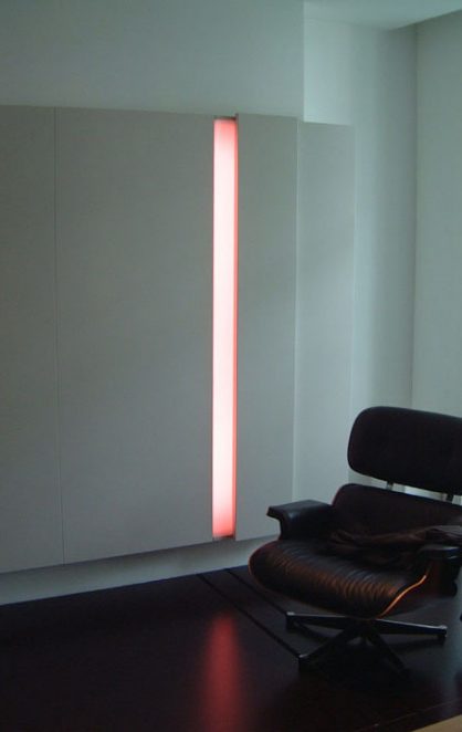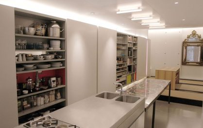 Designed for a couple who were set designers themselves for the theatre, the main living/sleeping area was devised as a “stage” on which a number of different activities could be enacted. From the desk and bench mounted on tracks, the room could be converted from office/meeting room to an intimate bedroom by deploying the concealed folding bed to rest on the bench.