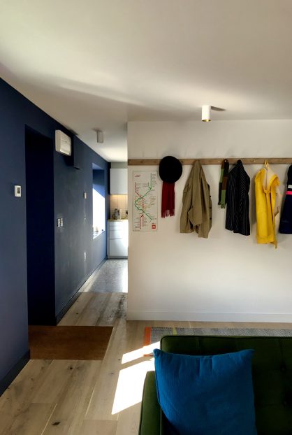 New materials and layout introduce a sense of calm and clarity whilst looking to retain an agricultural feel by using rough sawn oak floor boards. A bold and striking deep blue coloured wall work with the black cast iron woodstove and slate hearth to create a strong, purposeful character that also connects the living space to the kitchen/dining room giving a sense of continuity and interest. Roof beams uncovered in the roof space when opening the ceiling were sandblasted and oiled to give a sense of place as well as character.