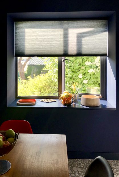 A simple, reduced material palette creates a clean, contemporary environment of high quality finishes that feel solid and coordinated. Pleated blinds give a soft diffused light establishing a calm, serene atmosphere. Reduced detailing throughout is followed through to the stair case with minimal joints and precise shadow gaps that help articulate the architectural elements. Contemporary fixtures and fittings are carefully chosen to balance the modern simplicity of the renovation with the agricultural context it sits within.