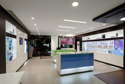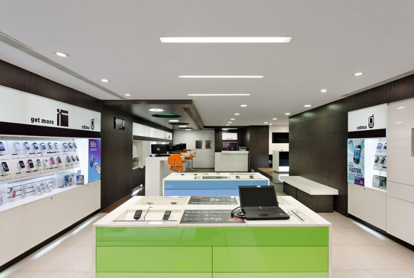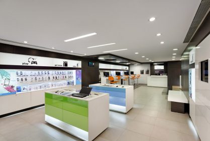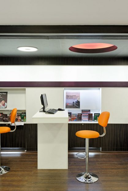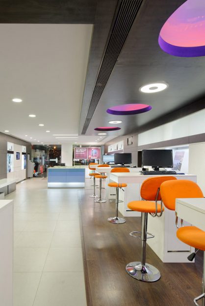 The design looked to reflect the brand identity and it’s attributes of bright, modern technological optimism. Concrete tiles are combined with mid-floor furniture and a wall system of back painted glass, giving a bright, shiny technical feel to the space. This is balanced with a rich timber area helping to delineate the consultation zone – the point at which you come into contact with people, emphasising the warm, human experience.