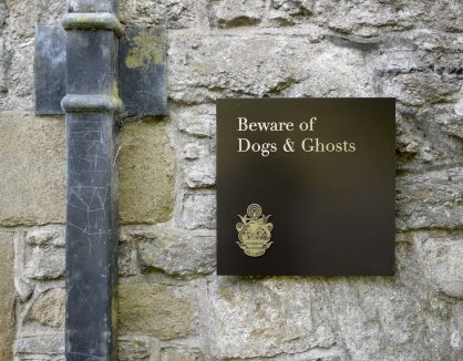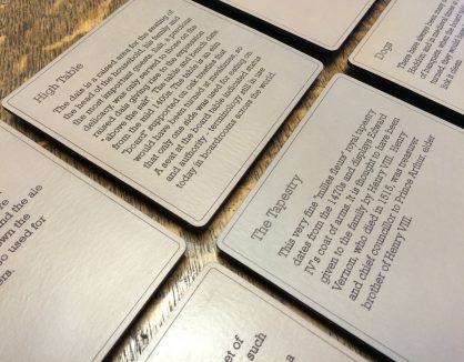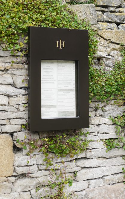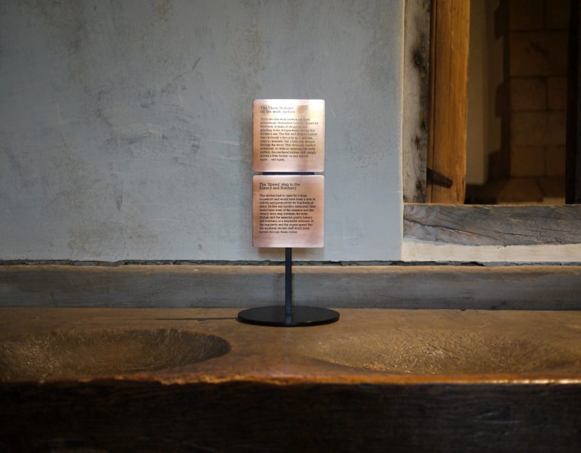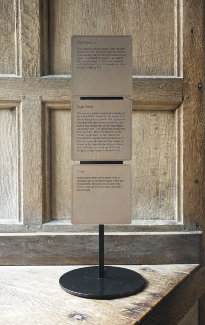 Laser-cut leatherwork brings traditional techniques a sharpness and contemporary feel but the materials and colour helps root the elements in place. Bronze was chosen outdoor signs and although a material/colour familiar to the middle ages, it does not exist at Haddon. This allowed the signs to be sympathetic to its context and at the same time stand out subtly.