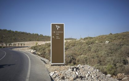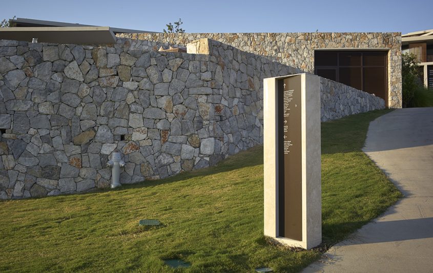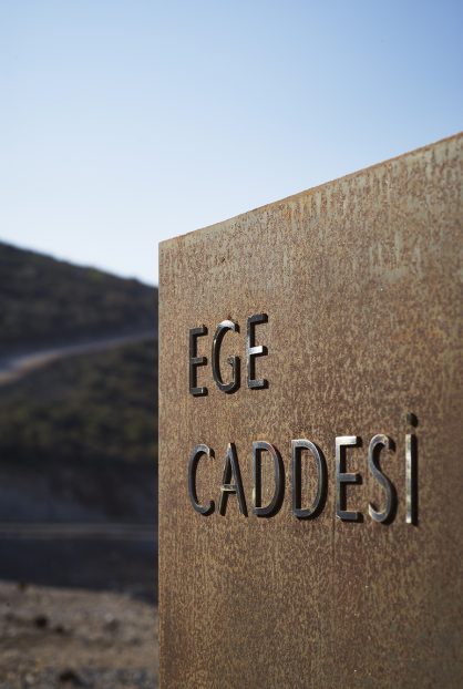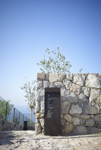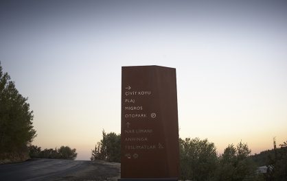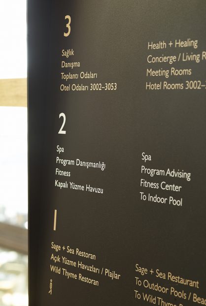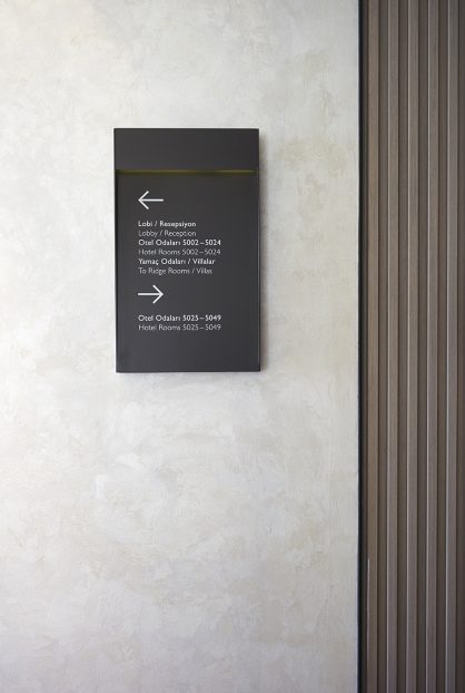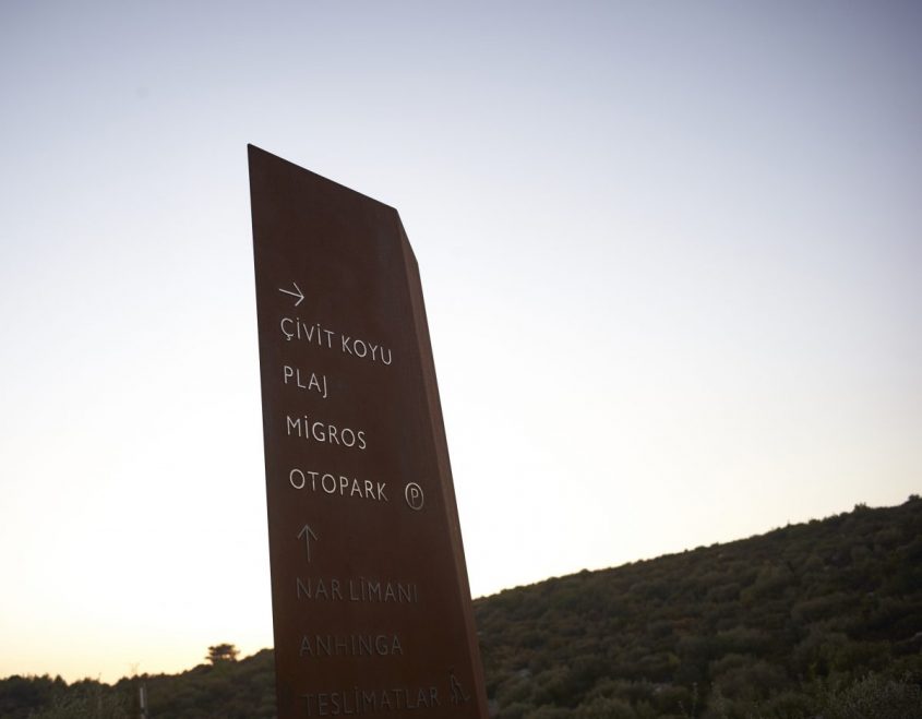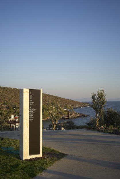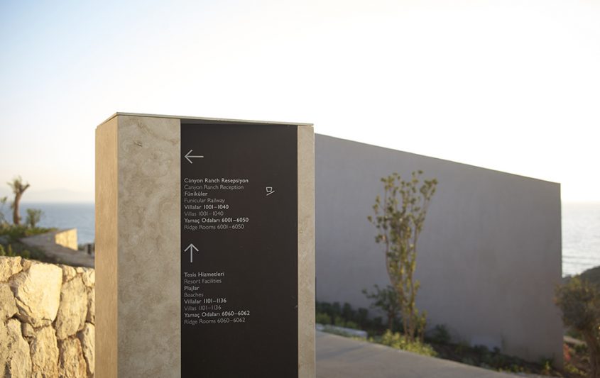 near Bodrum, Turkey. The signage includes interior as well as exterior families with distinctive material choices pertaining to the local geography as well as picking up on the materials and language of the architecture.