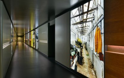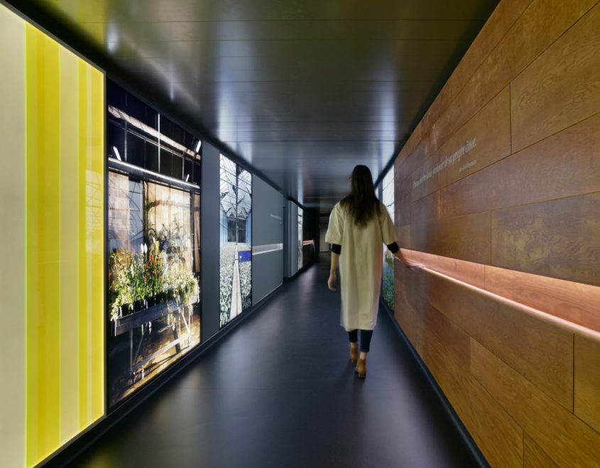 The project transforms a dark 100-metre-long corridor which symbolically connects an old and new wing of the hospital. It is an installation with art works by Jyll Bradley that gave a functional corridor a sense of space. Although the foreground is very much the artwork, essential elements such as handrails, signage, information display have been integrated into this installation. The artwork evolved through the engagement with the botanical gardeners of Lille and research into the city’s largely unrecognised history of botanical medicine.