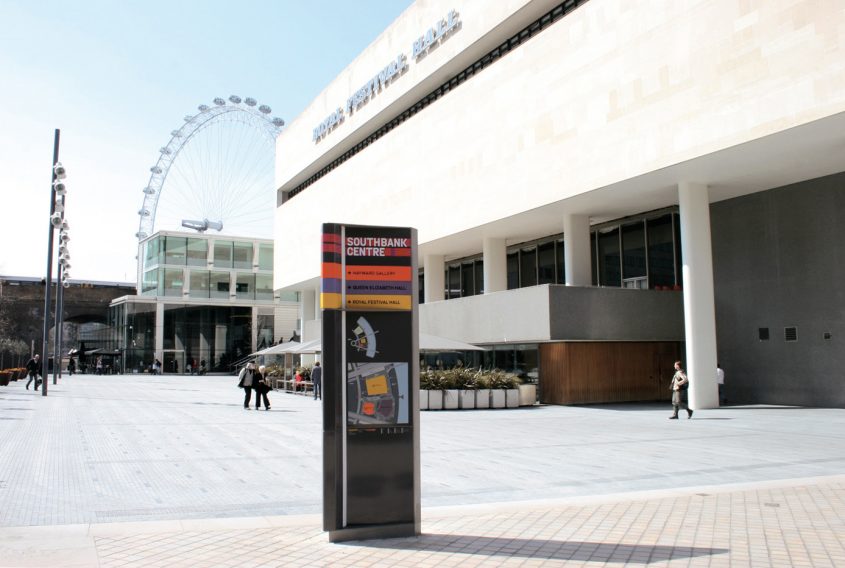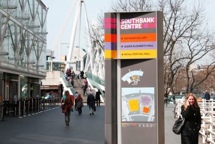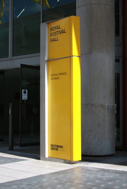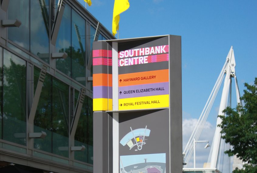 A comprehensive signage system that defines and pulls together the various buildings of the South Bank Centre Estate, spanning from Hungerford bridge to the boundary to the National Film Theatre. The system helps visitors navigate between Royal Festival Hall, Hayward Gallery, Queen Elizabeth Hall, Purcell Room, National Poetry Library and the connecting outdoor spaces. Internal signs have also been developed for the individual buildings, different for each building but retaining a strong family feel within the entire estate.